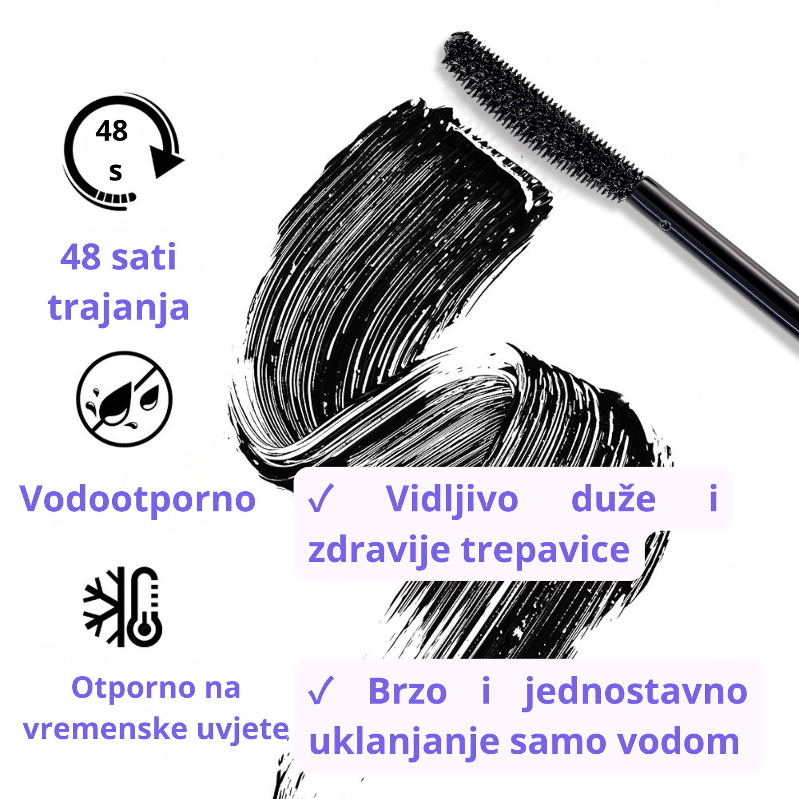 Vodootporna maskara koja se ne razmazuje i traje cijeli dan bez ljuštenja.